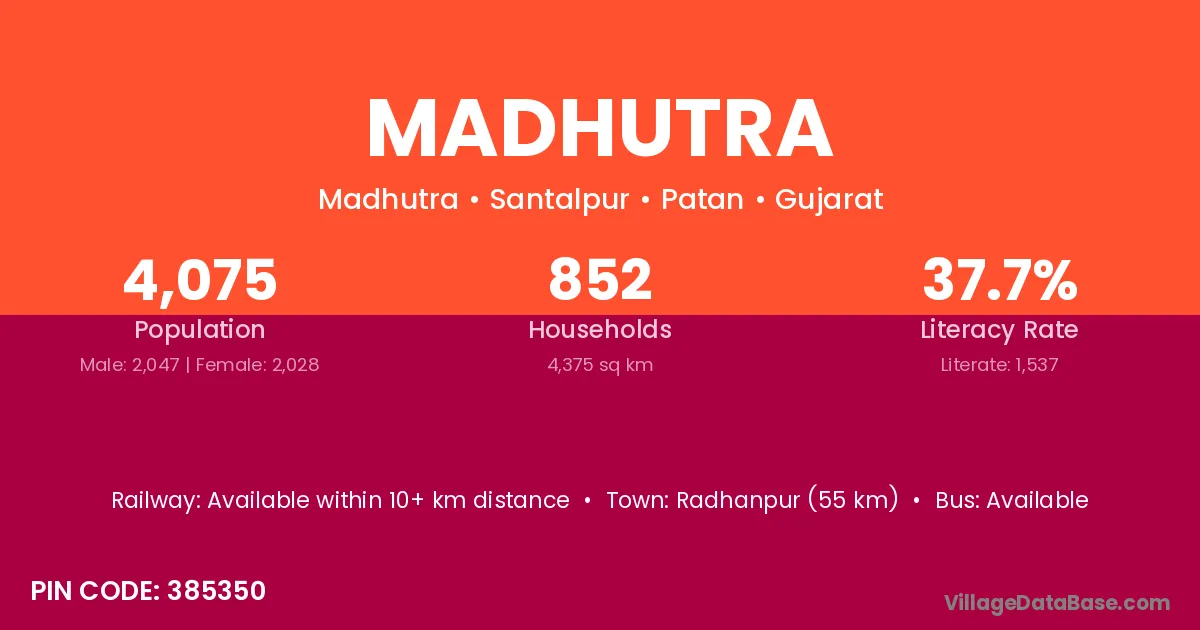 Radhanpur (55 km) is the nearest town to Madhutra village for major economic activities and is located approximately 55 km away.