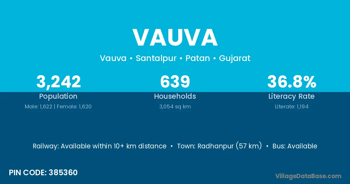 Radhanpur (57 km) is the nearest town to Vauva village for major economic activities and is located approximately 57 km away.