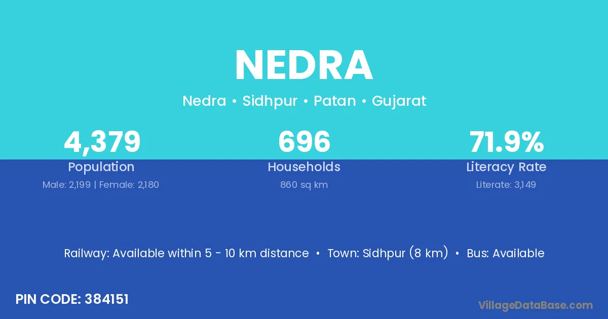 Sidhpur (8 km) is the nearest town to Nedra village for major economic activities and is located approximately 8 km away.