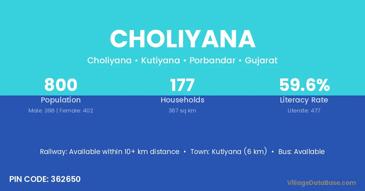Kutiyana (6 km) is the nearest town to Choliyana village for major economic activities and is located approximately 6 km away.