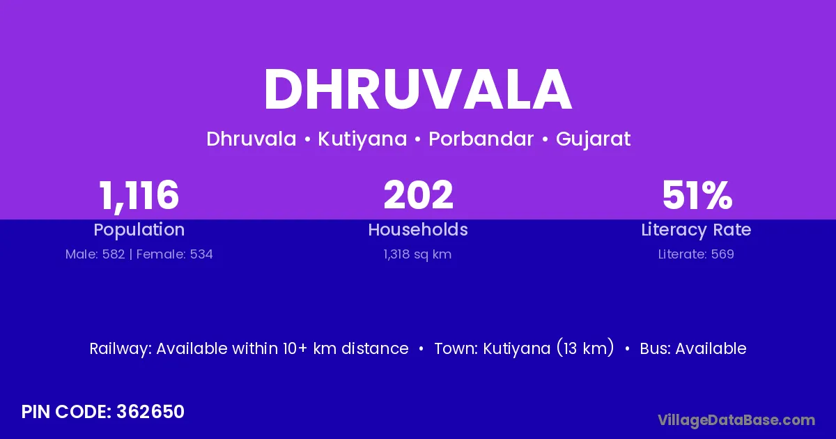 Kutiyana (13 km) is the nearest town to Dhruvala village for major economic activities and is located approximately 13 km away.