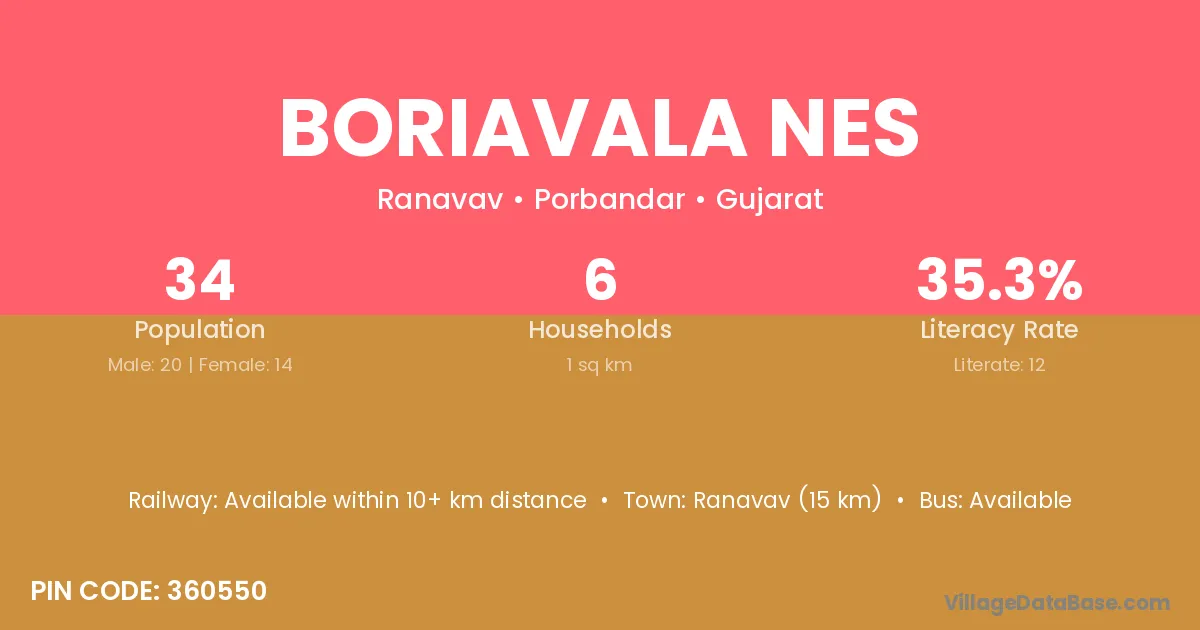 Ranavav (15 km) is the nearest town to Boriavala Nes village for major economic activities and is located approximately 15 km away.