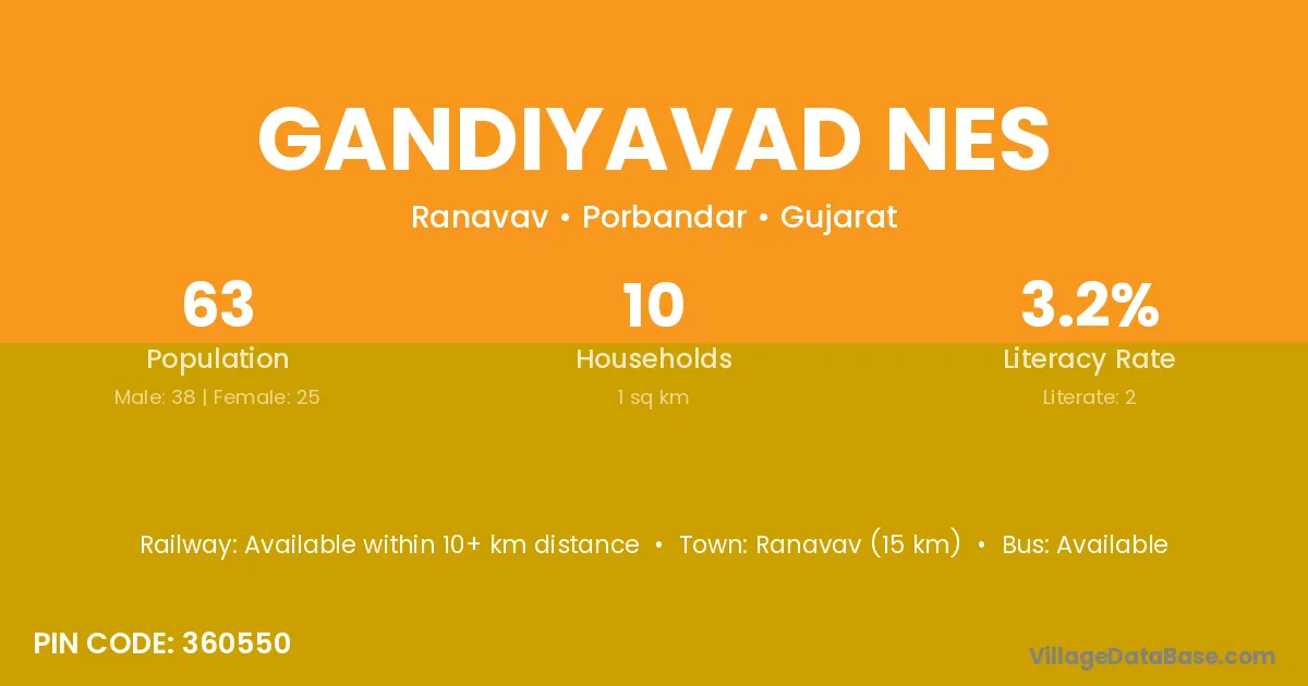 Ranavav (15 km) is the nearest town to Gandiyavad Nes village for major economic activities and is located approximately 15 km away.
