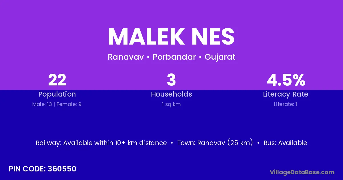 Ranavav (25 km) is the nearest town to Malek Nes village for major economic activities and is located approximately 25 km away.
