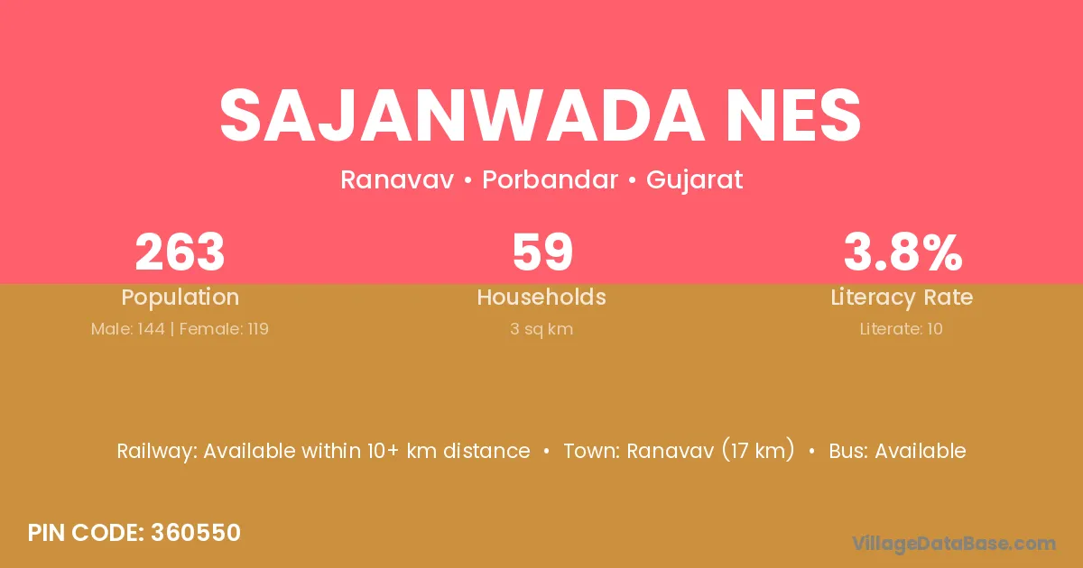 Ranavav (17 km) is the nearest town to Sajanwada Nes village for major economic activities and is located approximately 17 km away.
