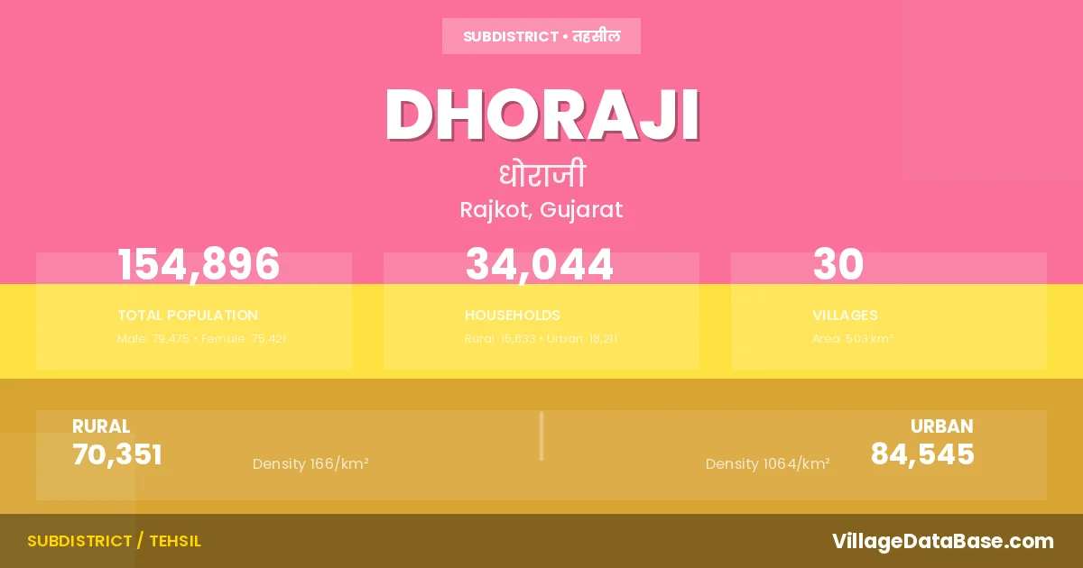 According to the 2011 census The total area of Dhoraji Taluka is 503 km², with a population of 154896 people. The population density is 308 inhabitants per square kilometre, and there are approximately 34044 houses in the sub district.