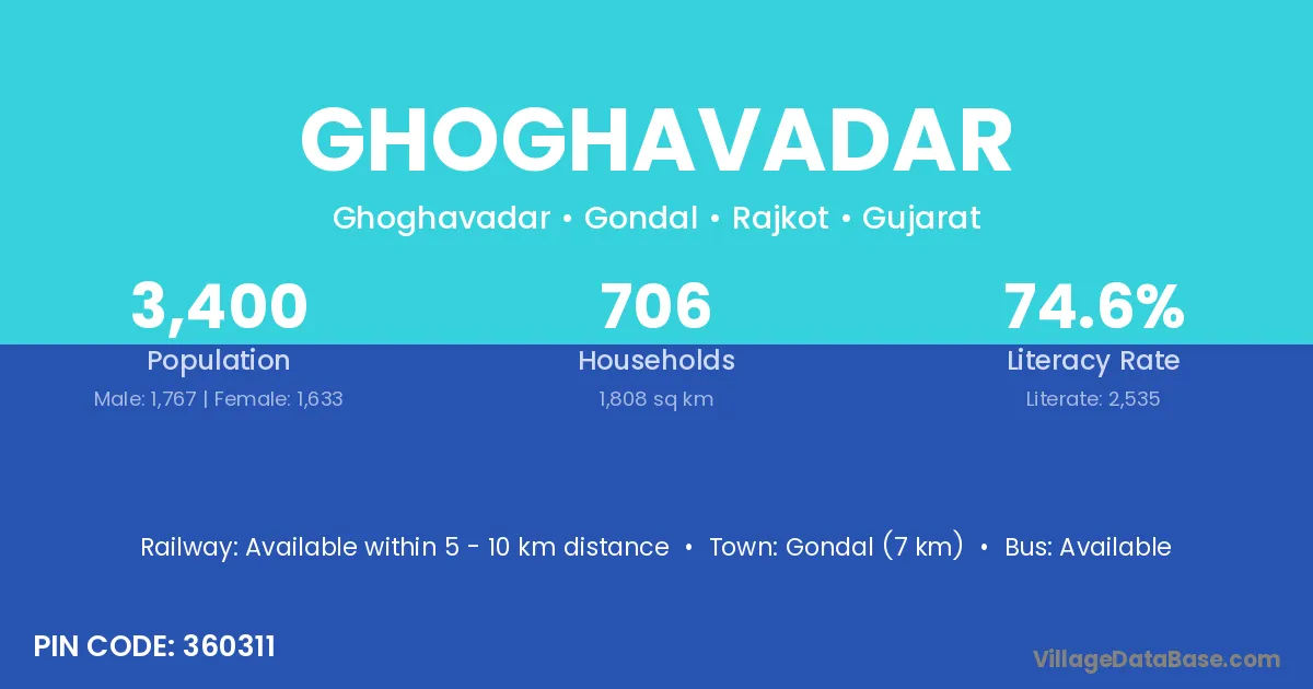 Gondal (7 km) is the nearest town to Ghoghavadar village for major economic activities and is located approximately 7 km away.