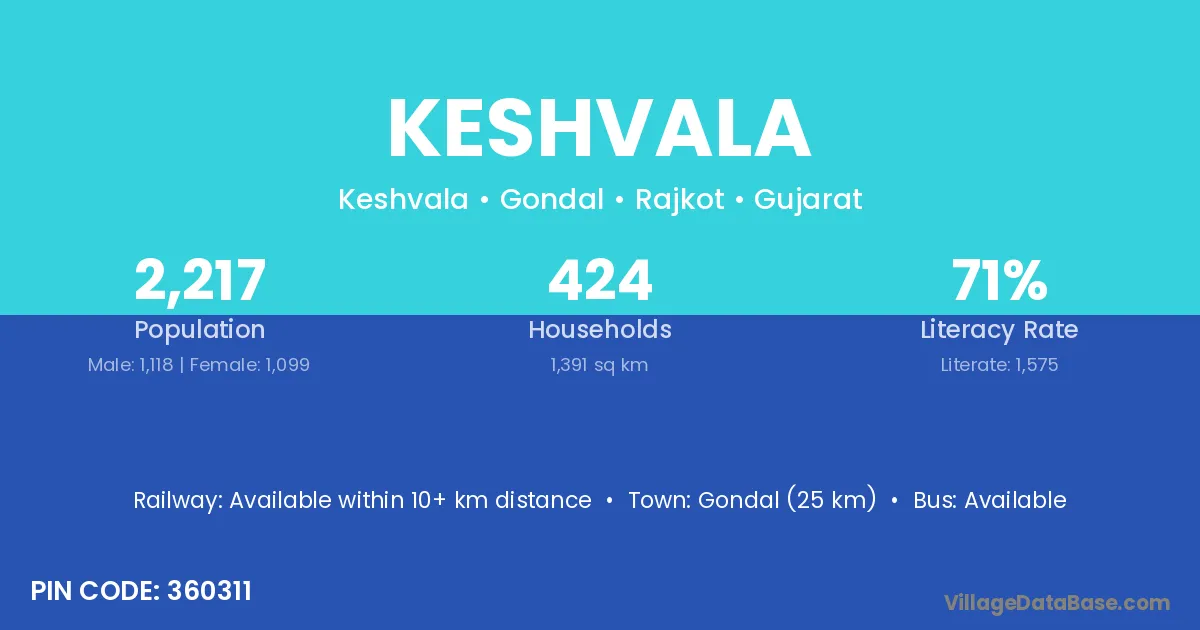 Gondal (25 km) is the nearest town to Keshvala village for major economic activities and is located approximately 25 km away.