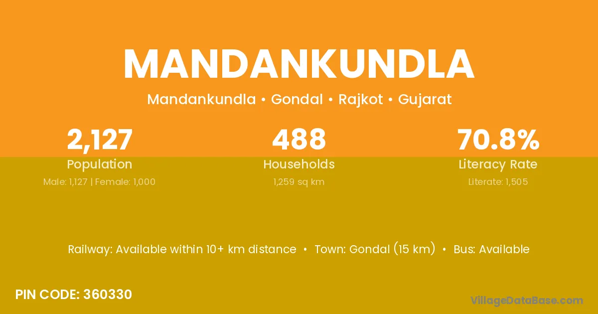 Gondal (15 km) is the nearest town to Mandankundla village for major economic activities and is located approximately 15 km away.