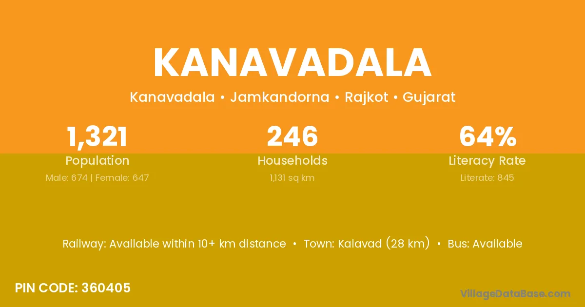 Kalavad (28 km) is the nearest town to Kanavadala village for major economic activities and is located approximately 28 km away.