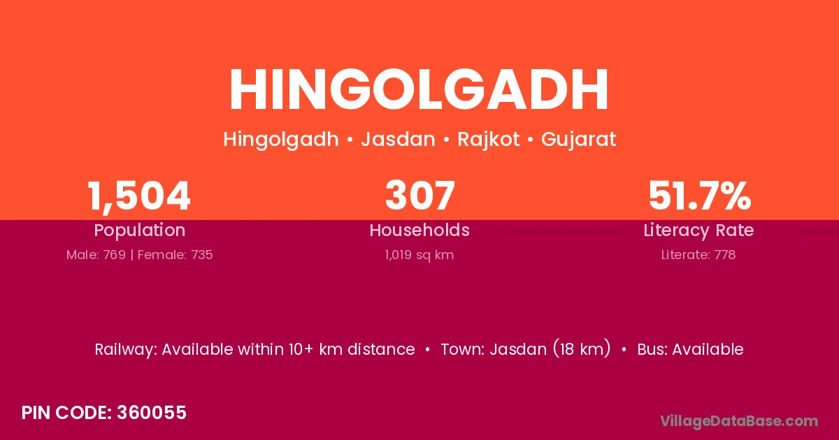 Hingolgadh village has a total population of 1,504 people, of which 769 are males and 735 are females.