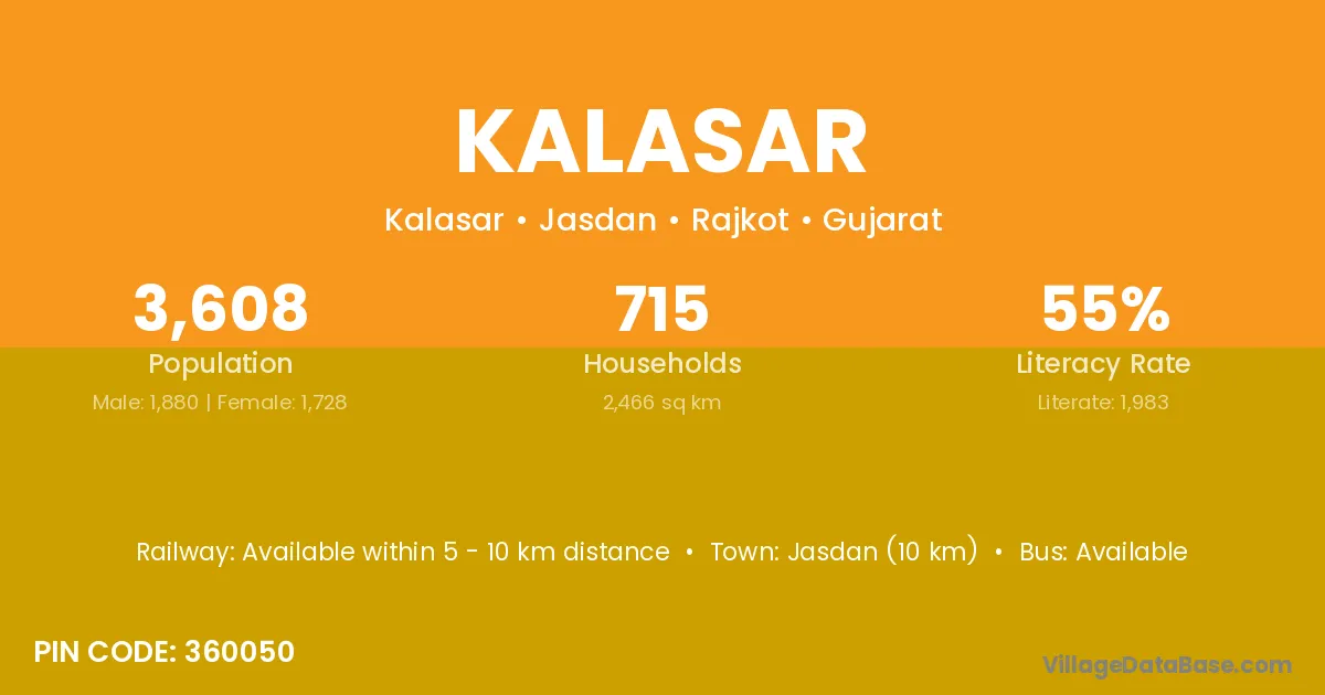 Jasdan (10 km) is the nearest town to Kalasar village for major economic activities and is located approximately 10 km away.