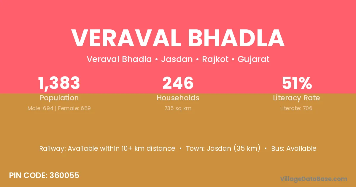 Jasdan (35 km) is the nearest town to Veraval Bhadla village for major economic activities and is located approximately 35 km away.