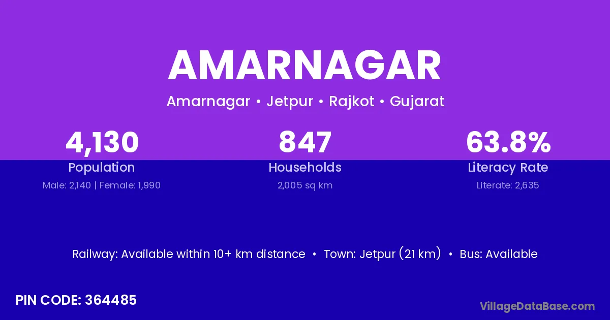 Jetpur (21 km) is the nearest town to Amarnagar village for major economic activities and is located approximately 21 km away.