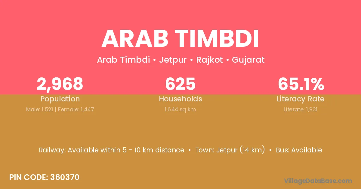 Jetpur (14 km) is the nearest town to Arab Timbdi village for major economic activities and is located approximately 14 km away.