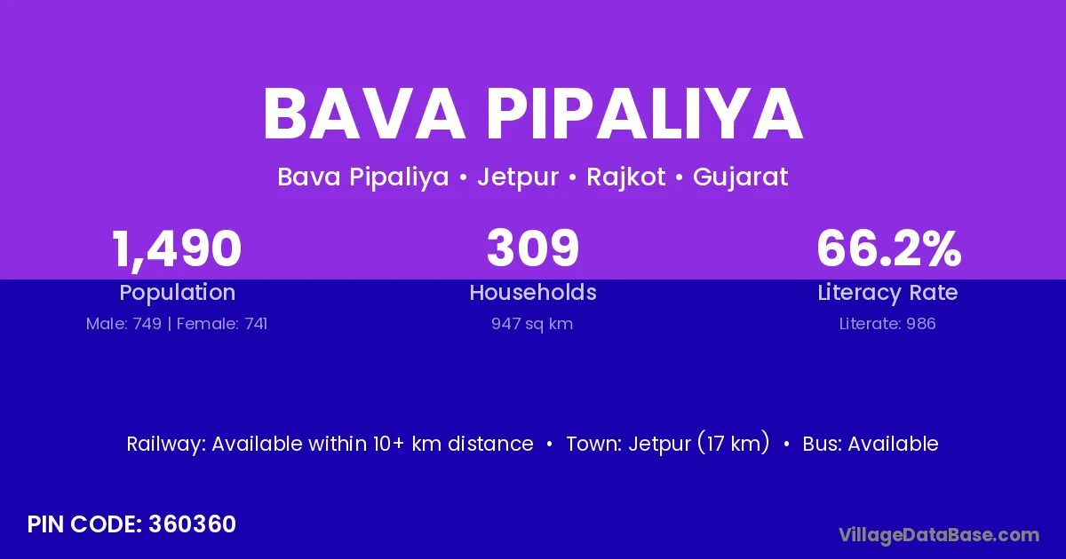 Jetpur (17 km) is the nearest town to Bava Pipaliya village for major economic activities and is located approximately 17 km away.