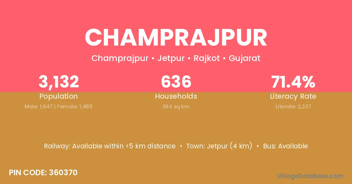 Jetpur (4 km) is the nearest town to Champrajpur village for major economic activities and is located approximately 4 km away.