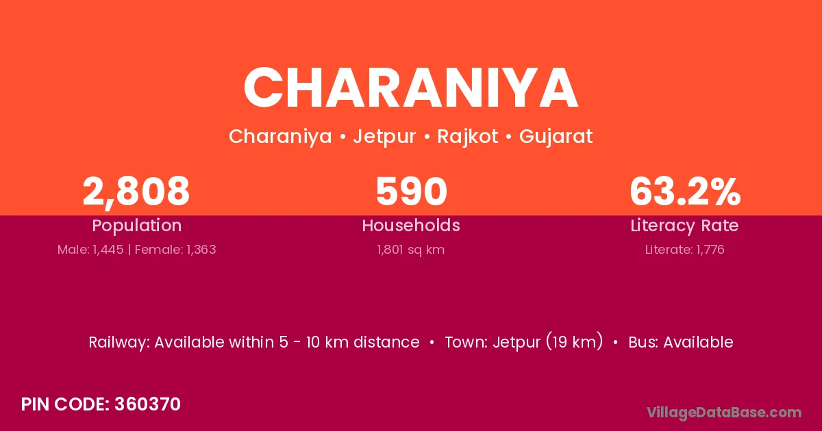 Jetpur (19 km) is the nearest town to Charaniya village for major economic activities and is located approximately 19 km away.