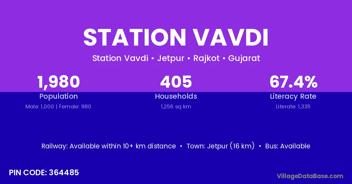 Jetpur (16 km) is the nearest town to Station Vavdi village for major economic activities and is located approximately 16 km away.