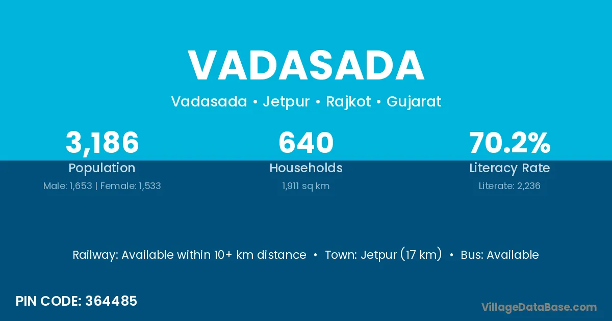 Jetpur (17 km) is the nearest town to Vadasada village for major economic activities and is located approximately 17 km away.