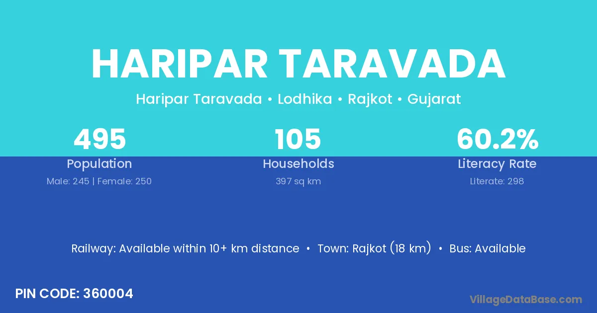 Rajkot (18 km) is the nearest town to Haripar Taravada village for major economic activities and is located approximately 18 km away.