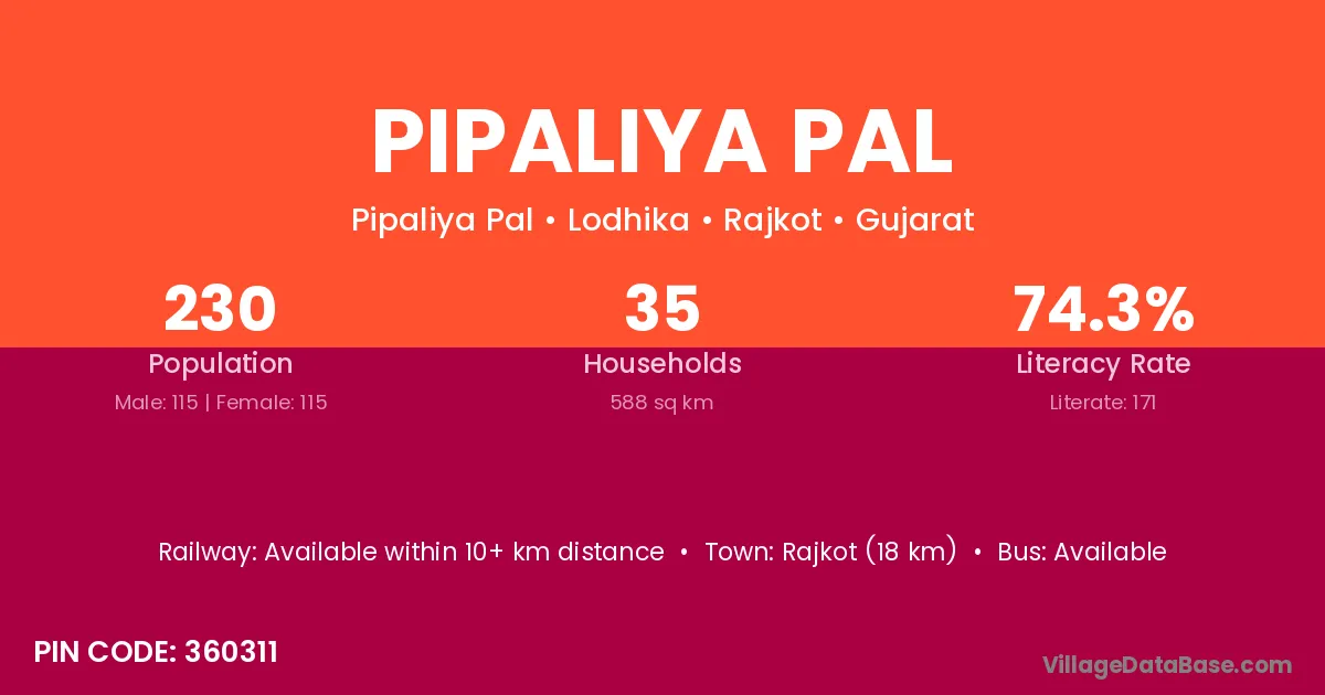 Pipaliya Pal village has a total population of 230 people, of which 115 are males and 115 are females.