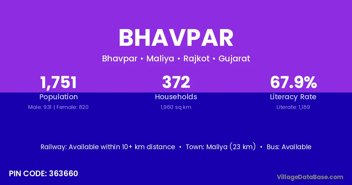Maliya (23 km) is the nearest town to Bhavpar village for major economic activities and is located approximately 23 km away.