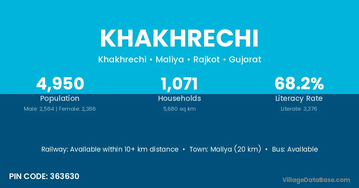Maliya (20 km) is the nearest town to Khakhrechi village for major economic activities and is located approximately 20 km away.