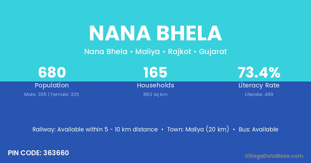 Maliya (20 km) is the nearest town to Nana Bhela village for major economic activities and is located approximately 20 km away.