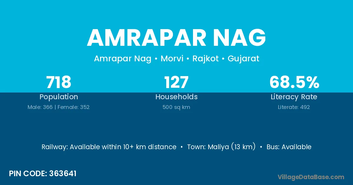 Maliya (13 km) is the nearest town to Amrapar Nag village for major economic activities and is located approximately 13 km away.