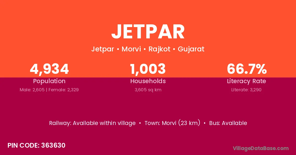 Morvi (23 km) is the nearest town to Jetpar village for major economic activities and is located approximately 23 km away.