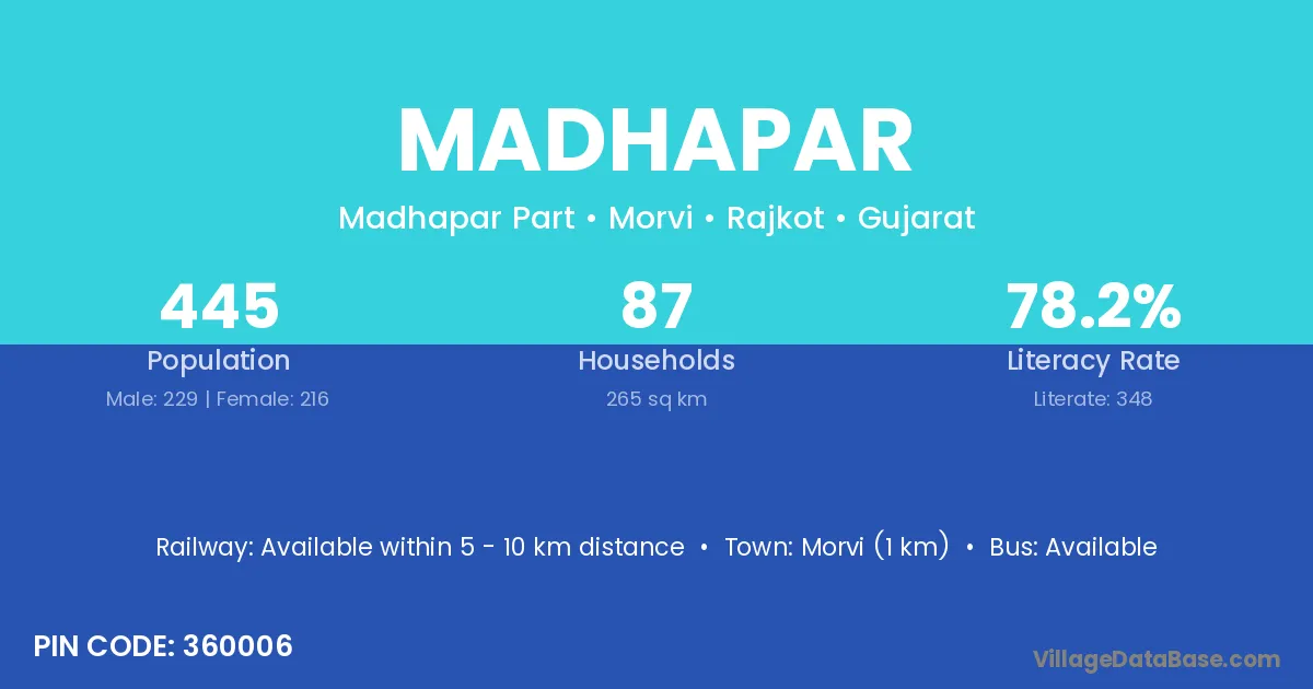 Madhapar village has a total population of 445 people, of which 229 are males and 216 are females.