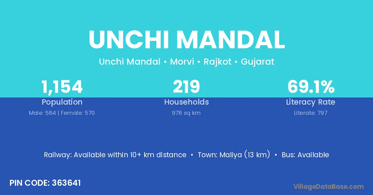 Maliya (13 km) is the nearest town to Unchi Mandal village for major economic activities and is located approximately 13 km away.