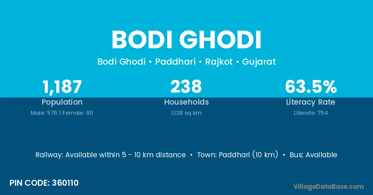 Bodi Ghodi village has a total population of 1,187 people, of which 576 are males and 611 are females.