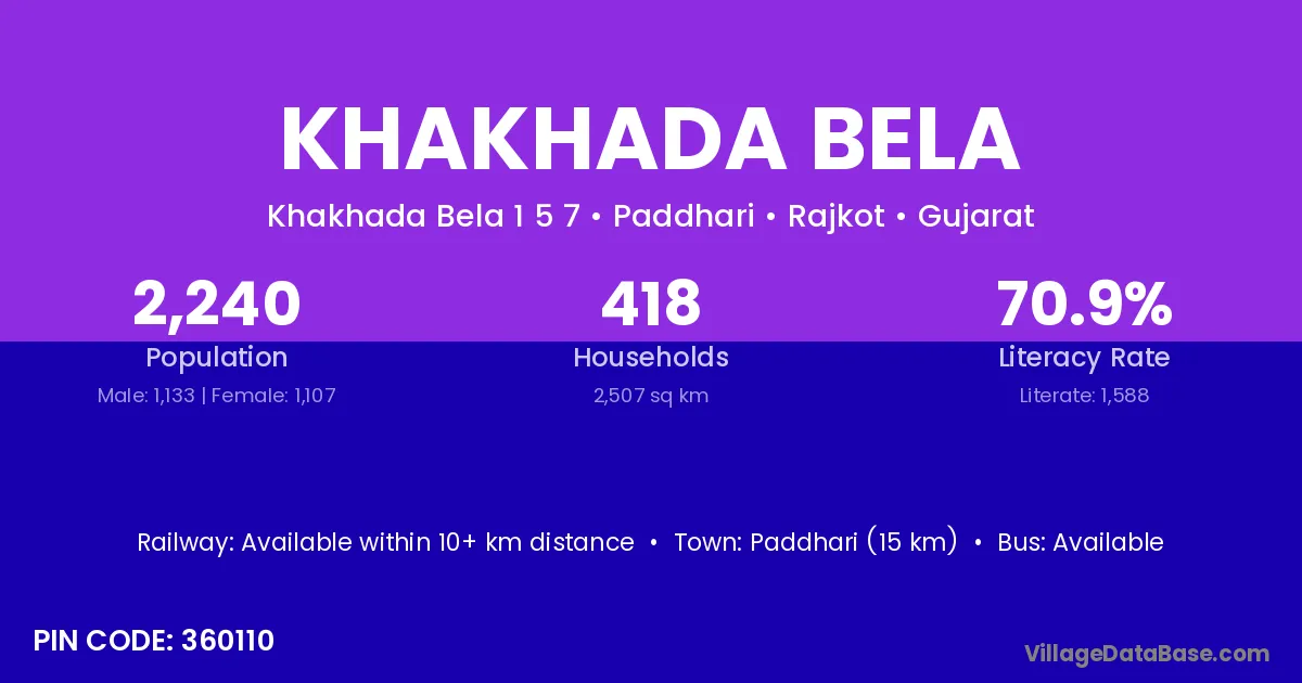 Khakhada Bela village has a total population of 2,240 people, of which 1,133 are males and 1,107 are females.