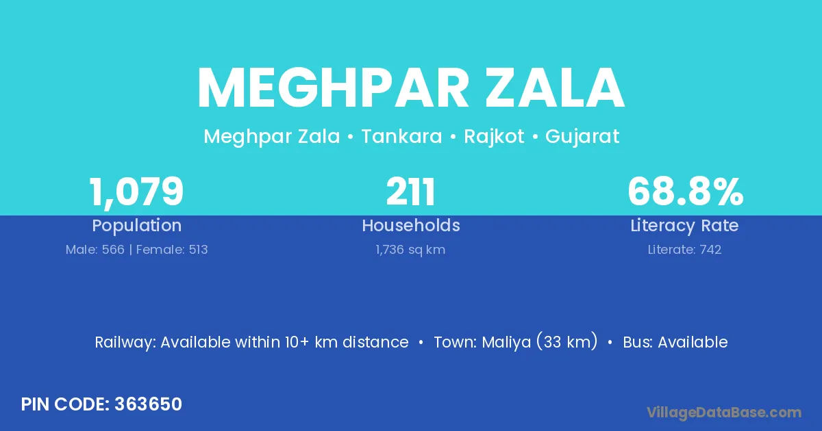 Maliya (33 km) is the nearest town to Meghpar Zala village for major economic activities and is located approximately 33 km away.