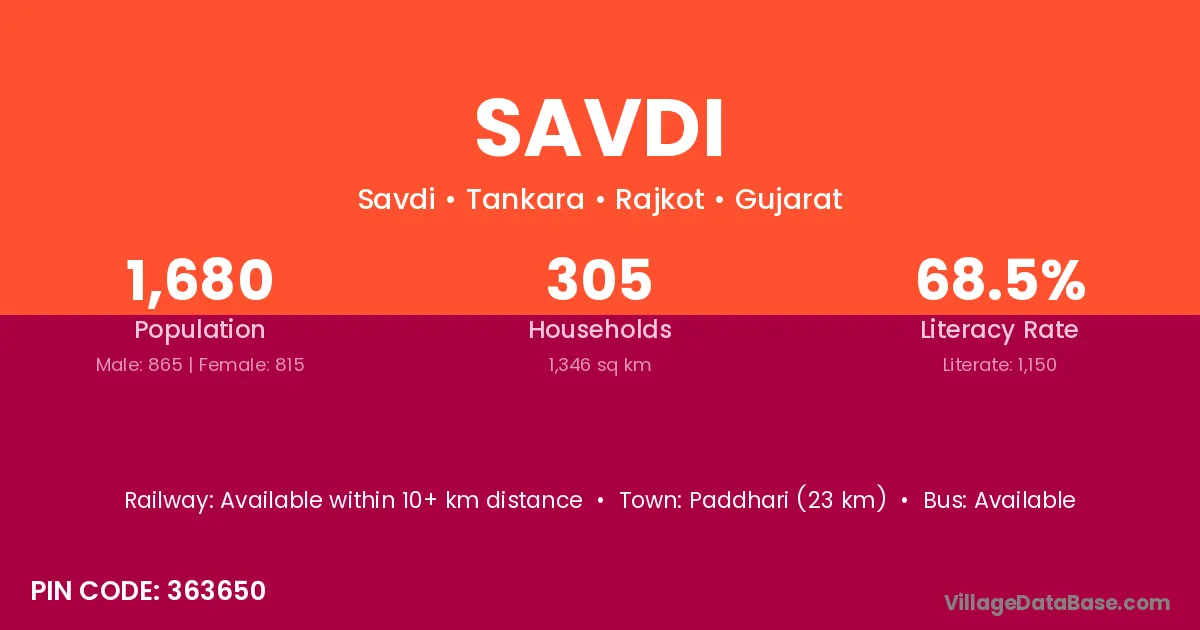 Savdi village has a total population of 1,680 people, of which 865 are males and 815 are females.