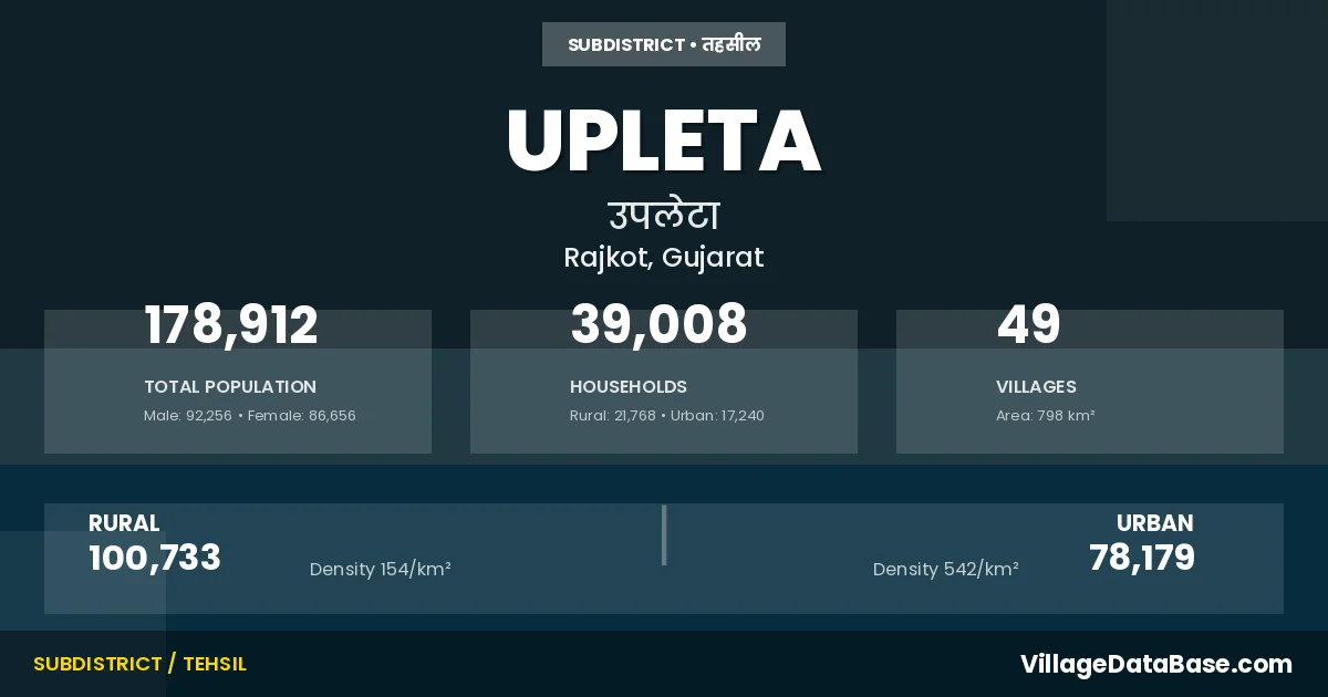 According to the 2011 census The total area of Upleta Taluka is 798 km², with a population of 178912 people. The population density is 224 inhabitants per square kilometre, and there are approximately 39008 houses in the sub district.