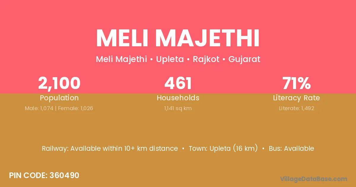 Upleta (16 km) is the nearest town to Meli Majethi village for major economic activities and is located approximately 16 km away.
