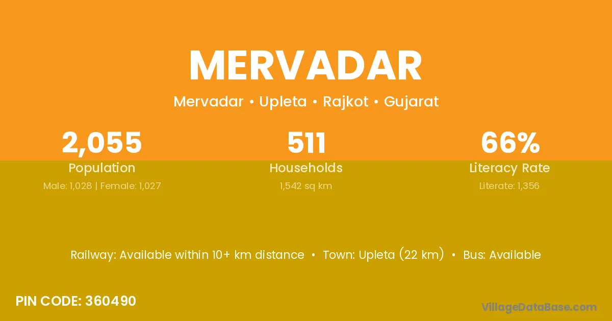 Upleta (22 km) is the nearest town to Mervadar village for major economic activities and is located approximately 22 km away.