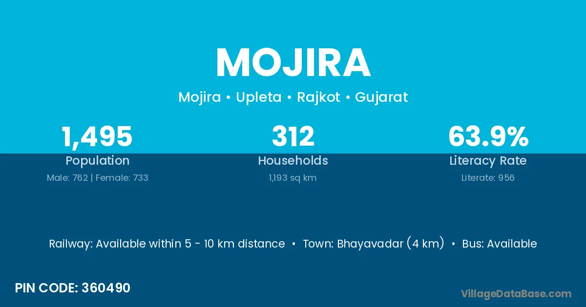 Bhayavadar (4 km) is the nearest town to Mojira village for major economic activities and is located approximately 4 km away.