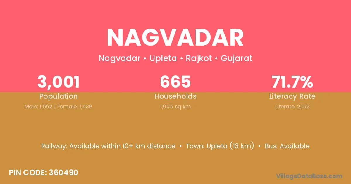 Upleta (13 km) is the nearest town to Nagvadar village for major economic activities and is located approximately 13 km away.