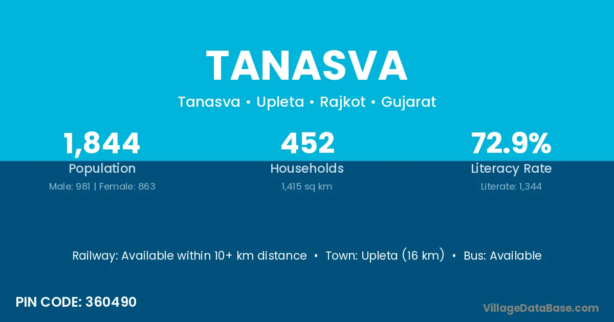 Upleta (16 km) is the nearest town to Tanasva village for major economic activities and is located approximately 16 km away.
