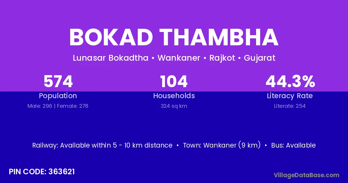 Wankaner (9 km) is the nearest town to Bokad Thambha village for major economic activities and is located approximately 9 km away.