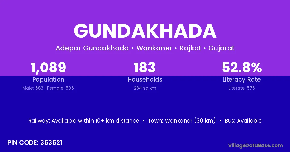 Wankaner (30 km) is the nearest town to Gundakhada village for major economic activities and is located approximately 30 km away.