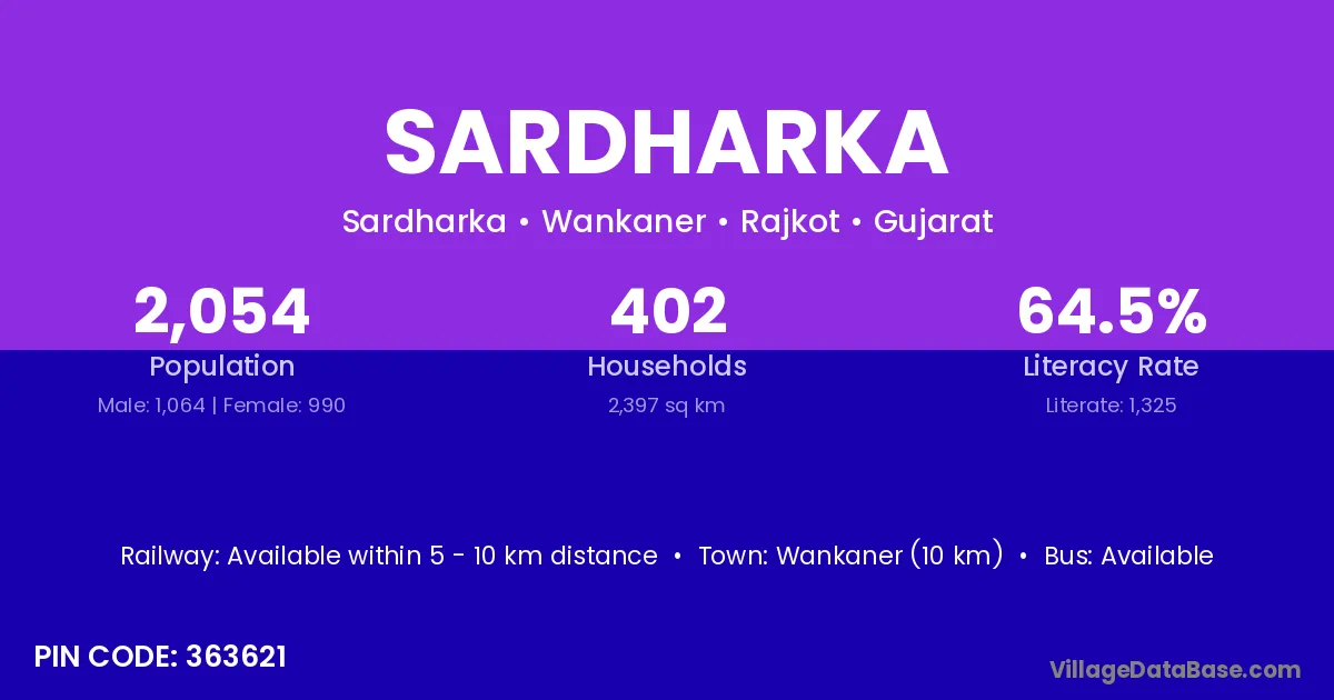 Wankaner (10 km) is the nearest town to Sardharka village for major economic activities and is located approximately 10 km away.