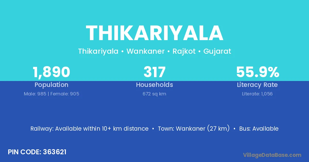 Wankaner (27 km) is the nearest town to Thikariyala village for major economic activities and is located approximately 27 km away.