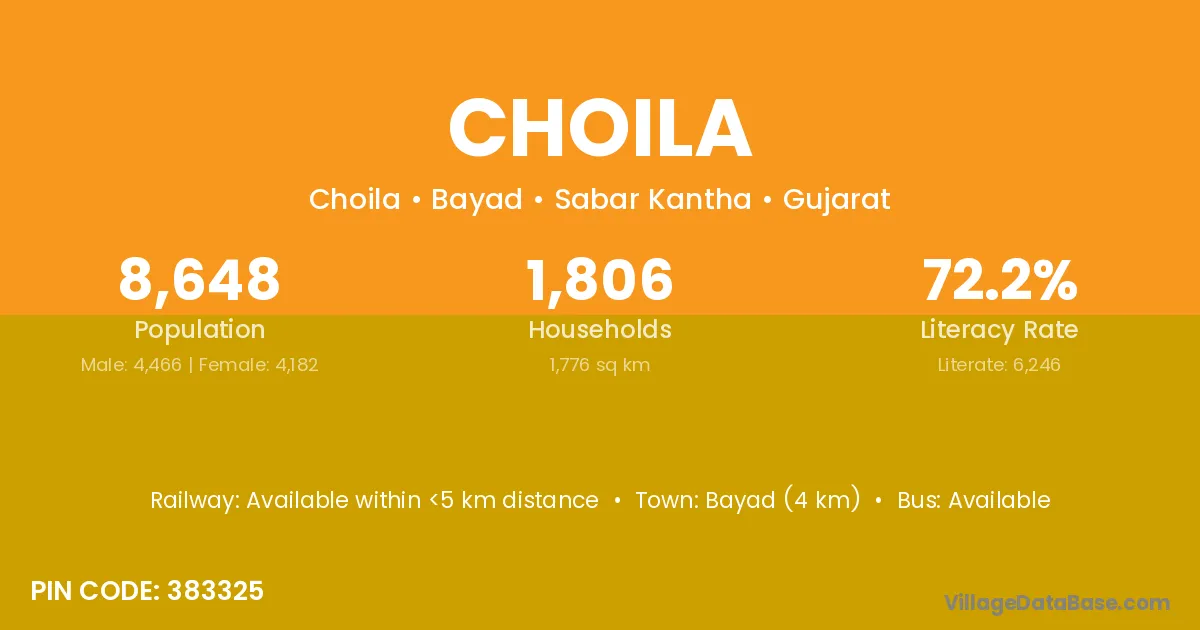 Bayad (4 km) is the nearest town to Choila village for major economic activities and is located approximately 4 km away.