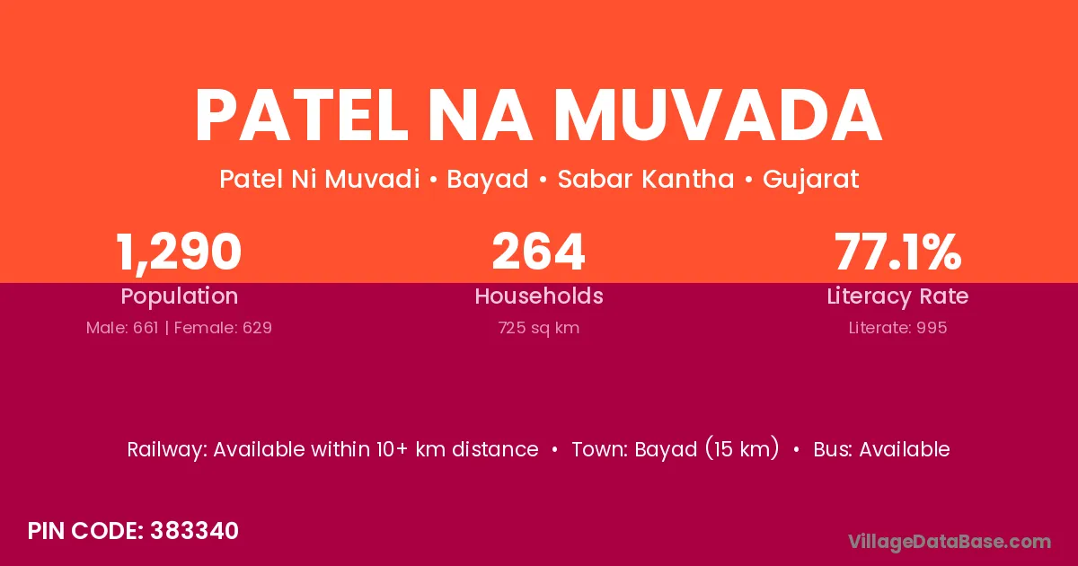 Patel Na Muvada village has a total population of 1,290 people, of which 661 are males and 629 are females.