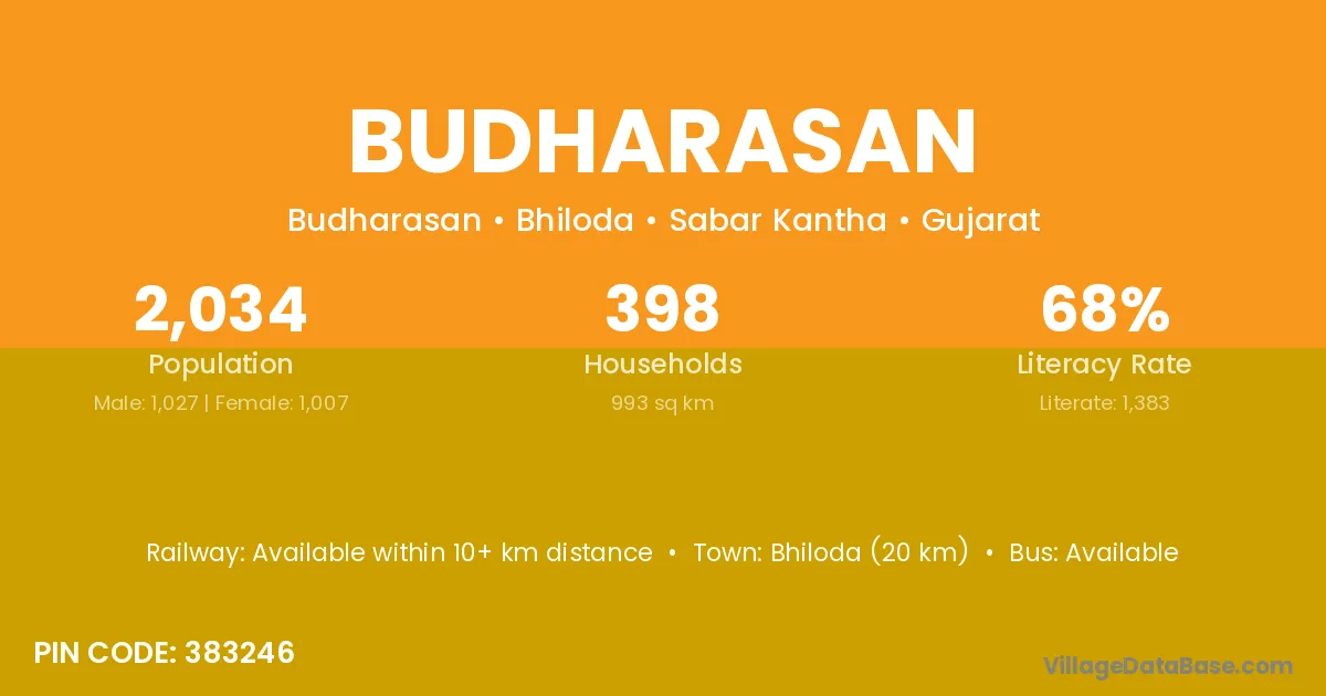 Bhiloda (20 km) is the nearest town to Budharasan village for major economic activities and is located approximately 20 km away.